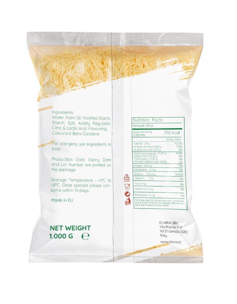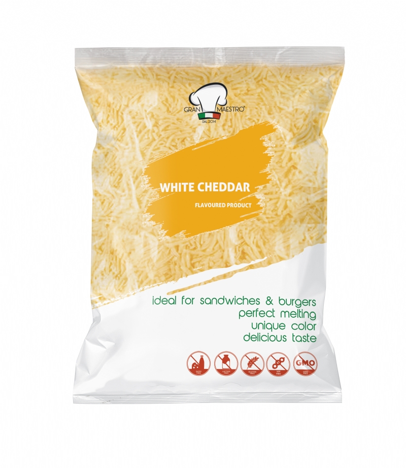 Delicious Shredded Functional White Cheddar Cheese made with Water, Vegetable Fat and Aromas in Greece.