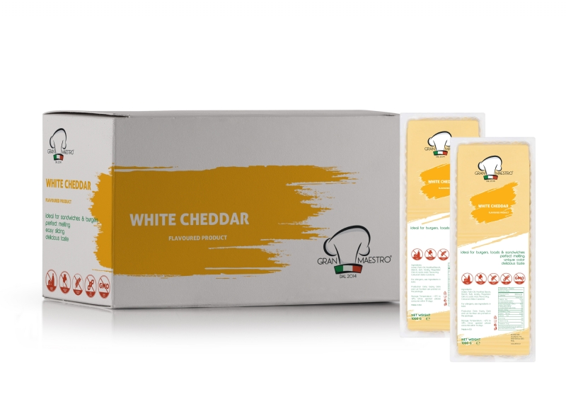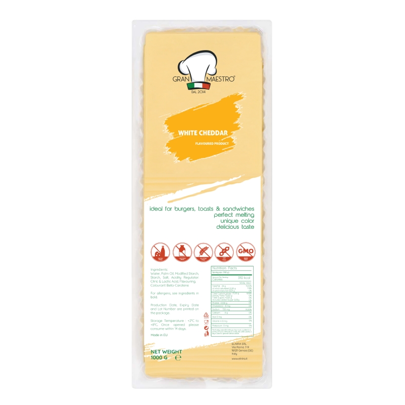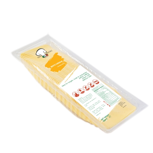 Delicious Sliced Functional White Cheddar Cheese made with Water, Vegetable Fat and Aromas in Greece.