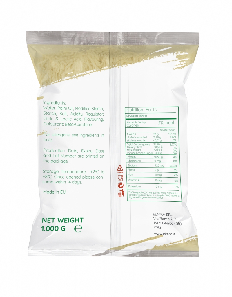 Delicious Imitation Shredded Emmental Cheese made with Water, Vegetable Fat and Aromas in Greece.