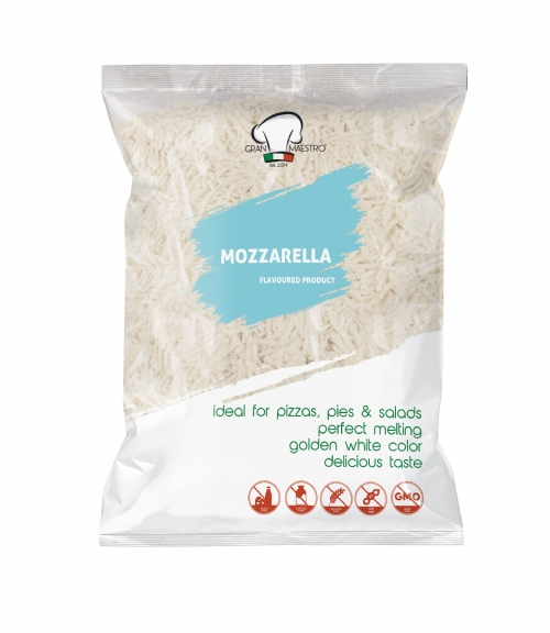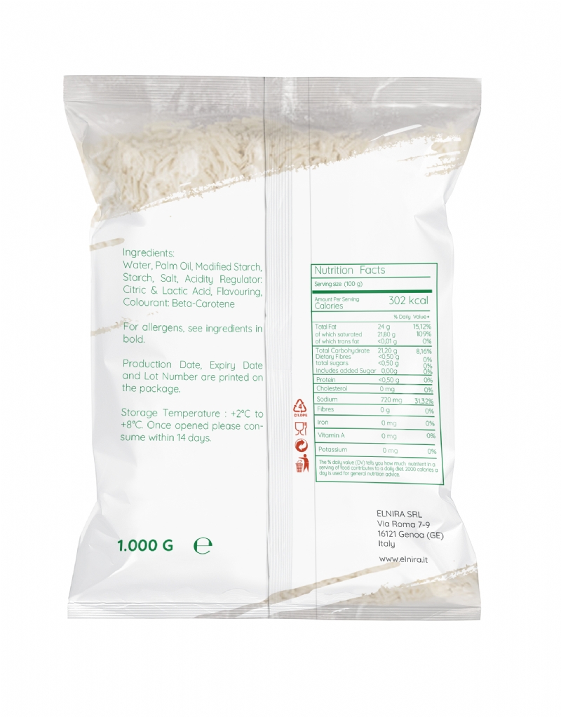 Delicious Imitation Shredded Mozzarella Cheese made with Water, Vegetable Fat and Aromas in Greece.