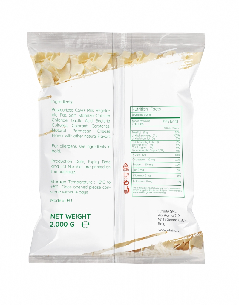 Beside the wide Packaging variety we are able to supply all our Flake Parmesan Cheese Blends with a long Shelf Life for our Retail, HoReCa, Wholesale and Industrial Customers.