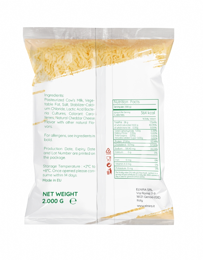 Beside the wide Packaging variety we are able to supply all our Shredded White Cheddar Cheese Blends with a long Shelf Life for our Retail, HoReCa, Wholesale and Industrial Customers.